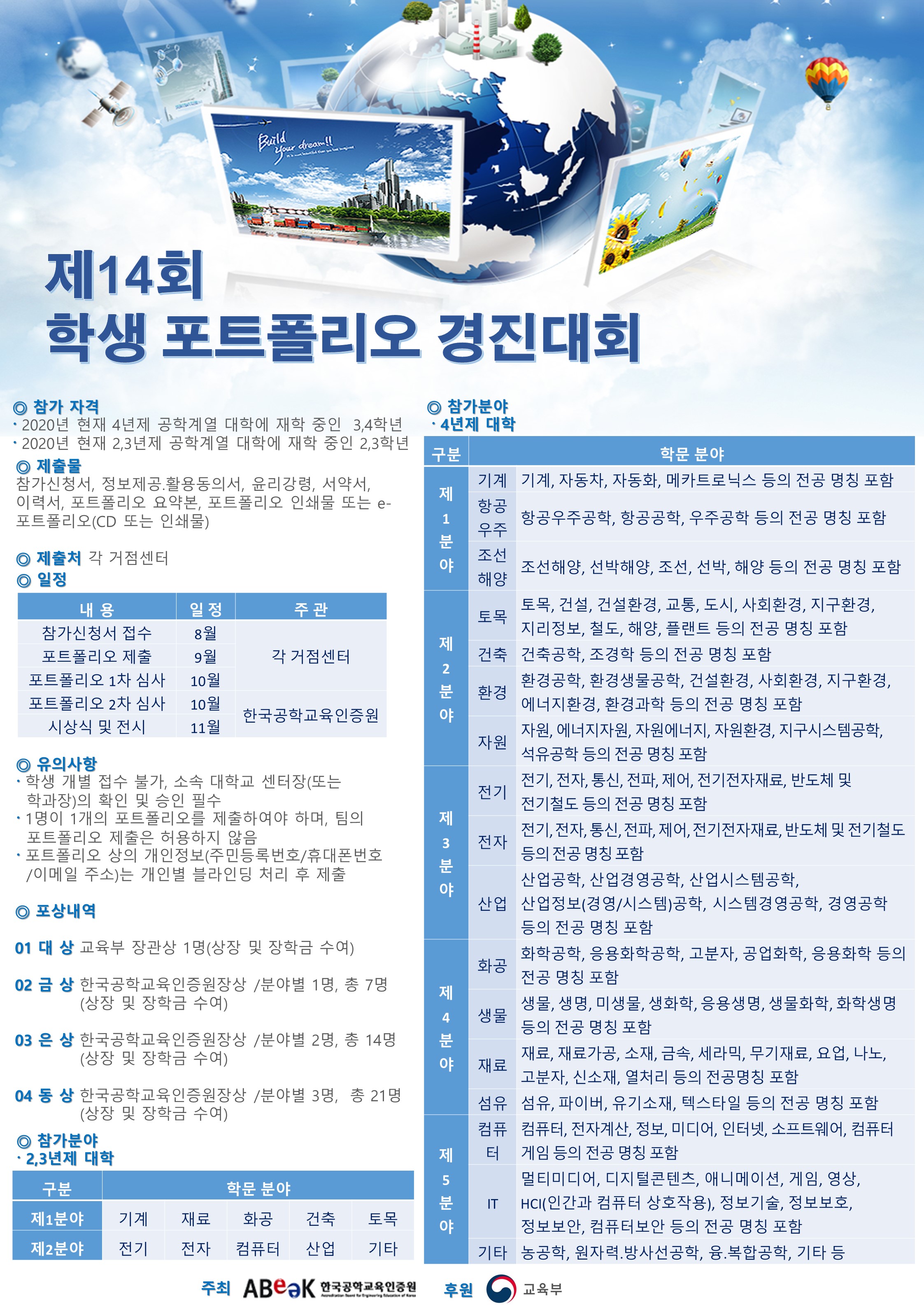한국공학교육인증원에서는 전국 공학계열 대학(2, 3, 4년제) 재학생들을 대상으로 “제14회 학생 포트폴리오 경진대회”를 개최합니다.