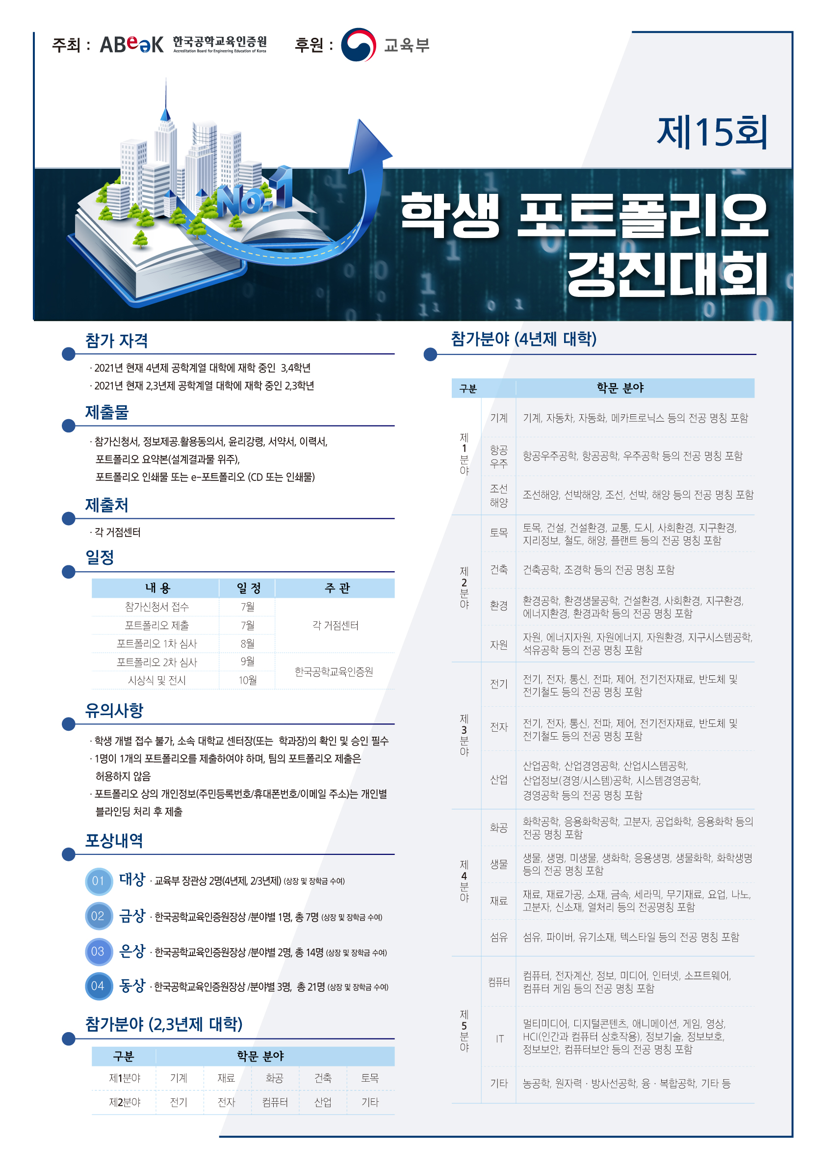 한국공학교육인증원에서는 전국 공학계열 대학(2, 3, 4년제) 재학생들을 대상으로 “제15회 학생 포트폴리오 경진대회”를 개최합니다.
