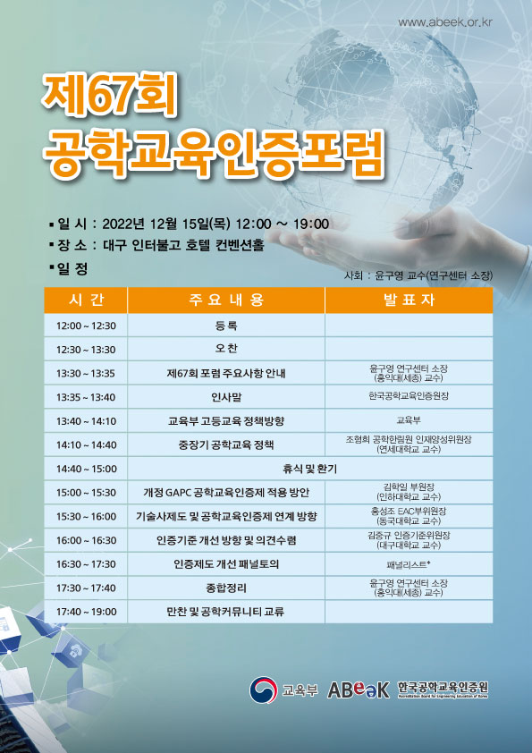 제 67회 공학교육인증포럼 및 20회 공학설계교육워크숍을 [아래]와 같이 개최하고자 하오니 많은 참석 부탁드립니다.