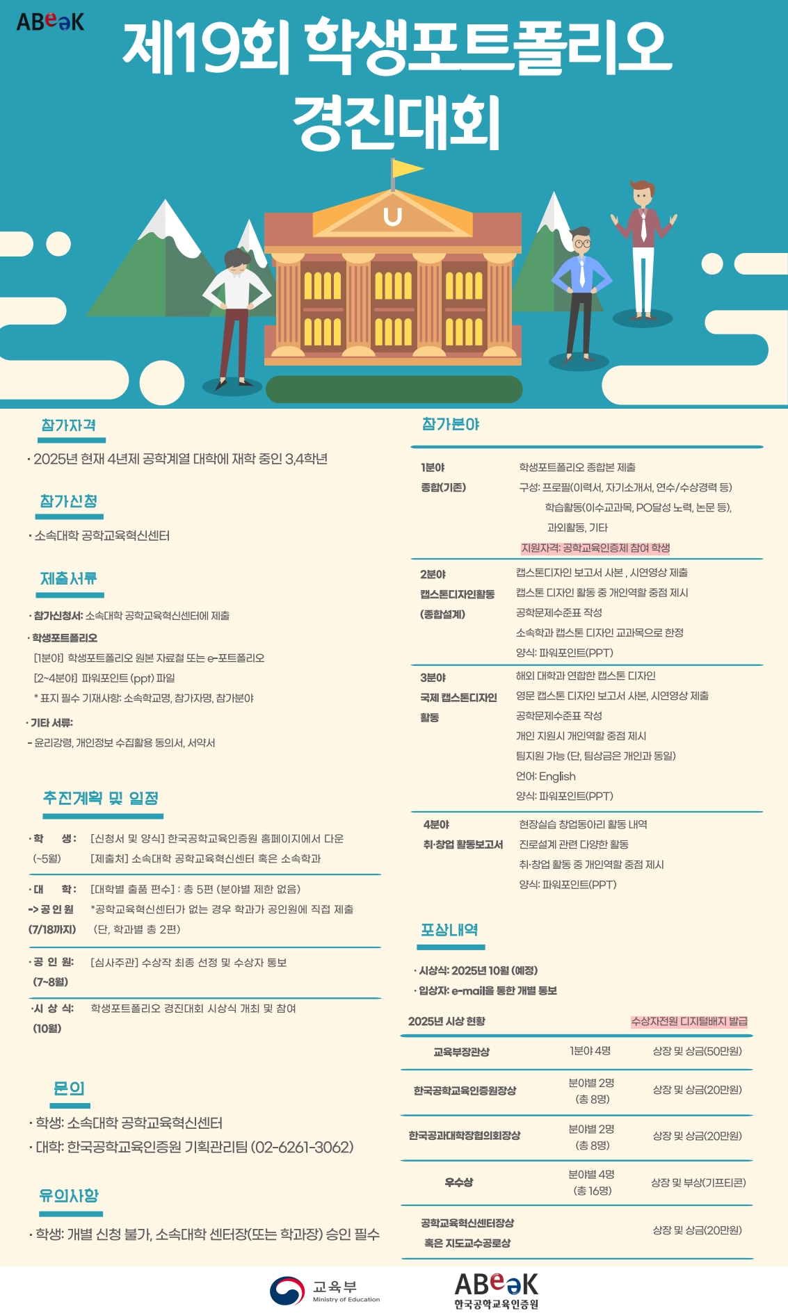 한국공학교육인증원에서는 전국 공학계열 대학 재학생들을 대상으로 "제19회 학생 포트폴리오 경진대회"를 개최합니다.